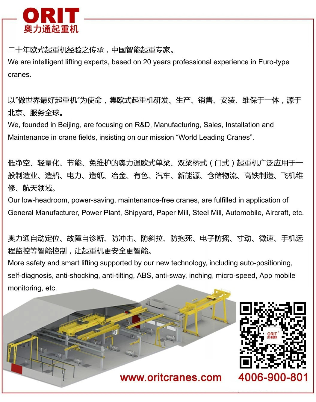 奧力通起重機(jī)作為智能起重機(jī)專家,致力于歐式起重機(jī)智能化研發(fā)與應(yīng)用,其自動(dòng)控制、電子防搖、視覺識(shí)別、遠(yuǎn)程診斷等智能技術(shù)已經(jīng)成功應(yīng)用于各行業(yè)智能倉庫、智能吊運(yùn)等作業(yè)場(chǎng)合,幫助客戶邁入工業(yè)4.0智能工廠。