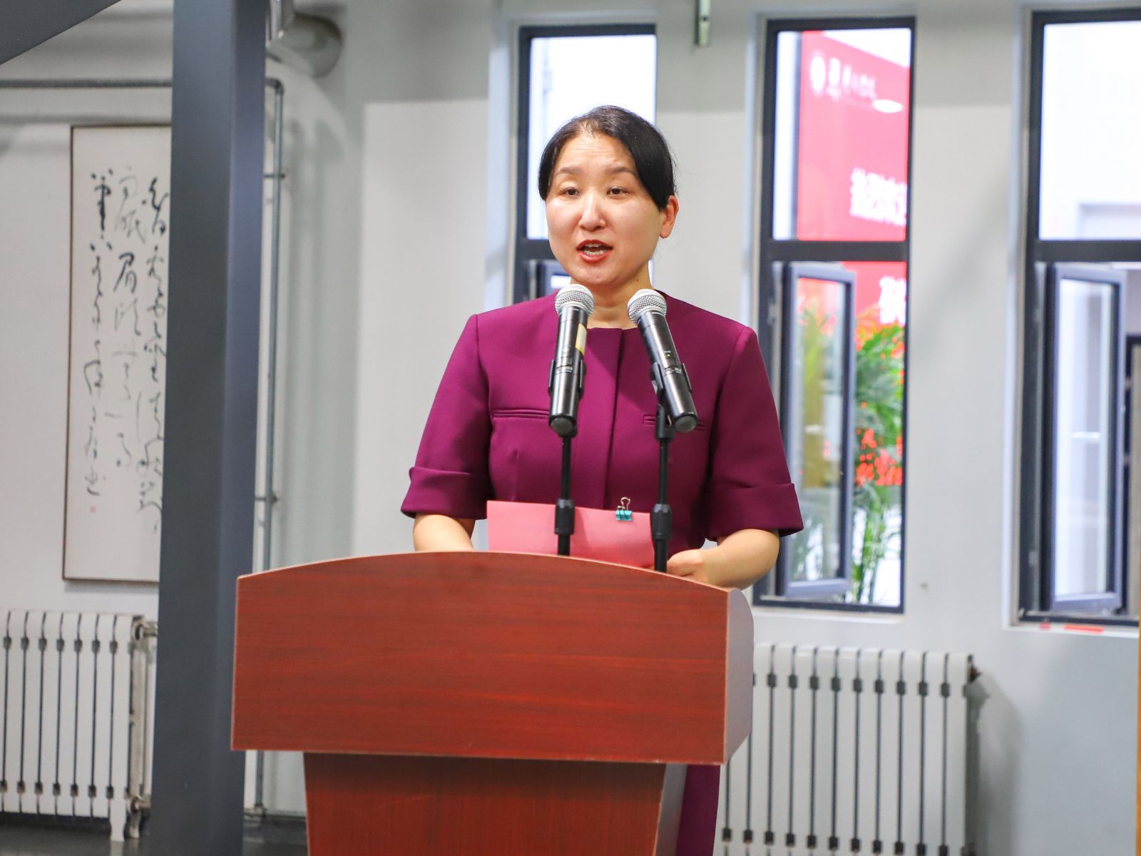 山東財經大學藝術學院黨委書記楊揚致辭,她表示一年一度的藝術學院藝術品競拍會即將精彩呈現,首先對支持藝術學院藝術實踐活動的各位領導嘉賓和社會各界人士表示衷心的感謝和熱烈歡迎。在社會各界和學校相關部門的支持幫助下,競拍活動已成為藝術學院本科教學過程中的一個亮點,同時已成為實踐課堂和校園文化不可或缺的重要組成部分。較于往屆,本屆藝術品競拍活動體現出明顯的優化與升級。同時,一場精彩的拍賣會需要拍賣師和競拍人的積極互動,大家每一次踴躍地舉牌和熱情地喊價,都是對青年學子藝術創作的充分肯定和莫大鼓勵,也是對藝術學院教學工作的巨大支持。再次感謝大家的光臨,讓我們共同期待競拍會的精彩呈現!