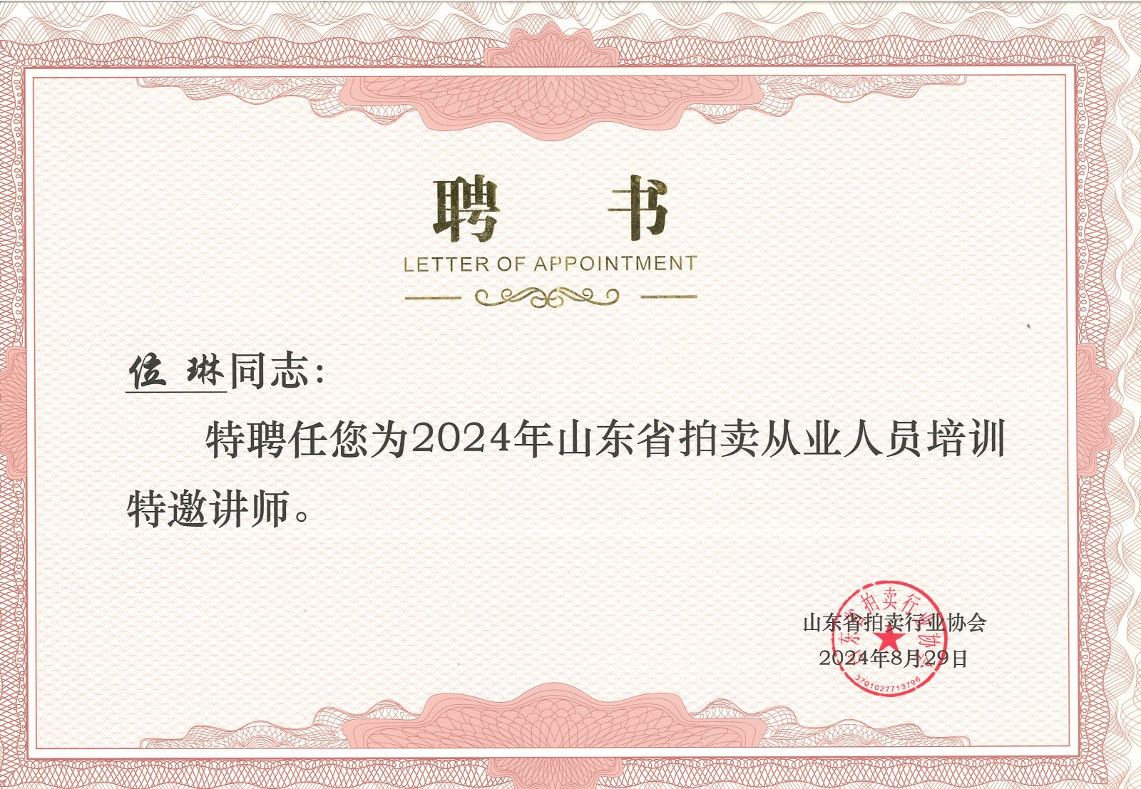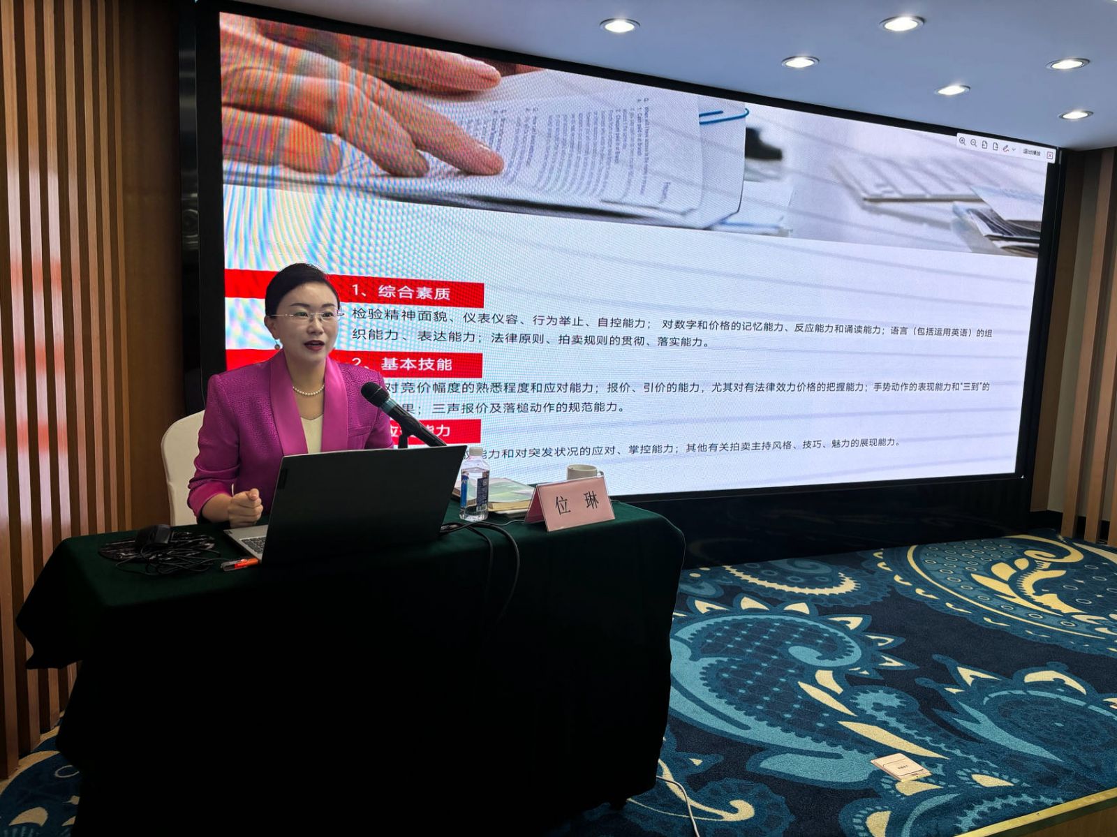 本次培訓(xùn)班省拍協(xié)聘請中國拍賣行業(yè)協(xié)會(huì)拍賣師主持技巧考試教官、考官李麗和位琳為特邀講師,并現(xiàn)場頒發(fā)了聘書。