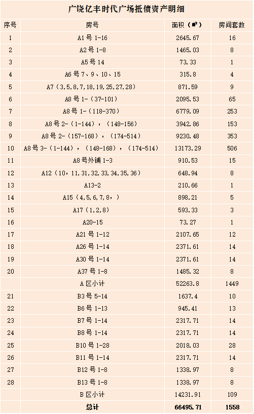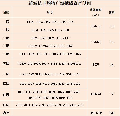基本情況:該抵債資產(chǎn)位于東營(yíng)市廣饒縣廣饒濰高路888號(hào)億豐國(guó)際時(shí)代廣場(chǎng),廣饒老汽車(chē)站西鄰。總建筑面積66495.71㎡,房間1558套,經(jīng)法院裁定抵債,未辦理過(guò)戶(hù)手續(xù)。